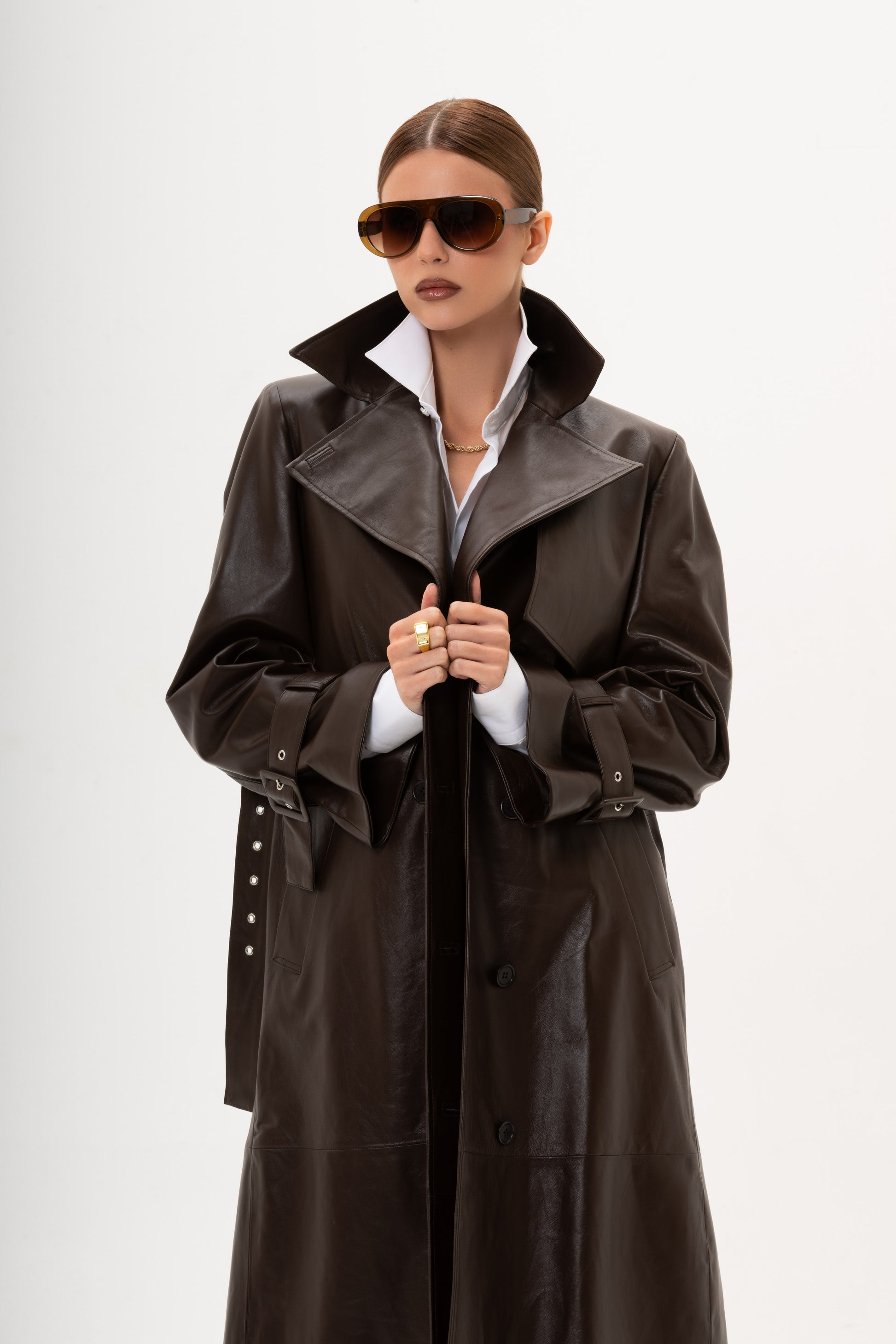 Trench in pelle di agnello, foderato con abbottonatura frontale, mostrine ai polsi, include cintura regolabile in tinta con fibbia, due tasche.