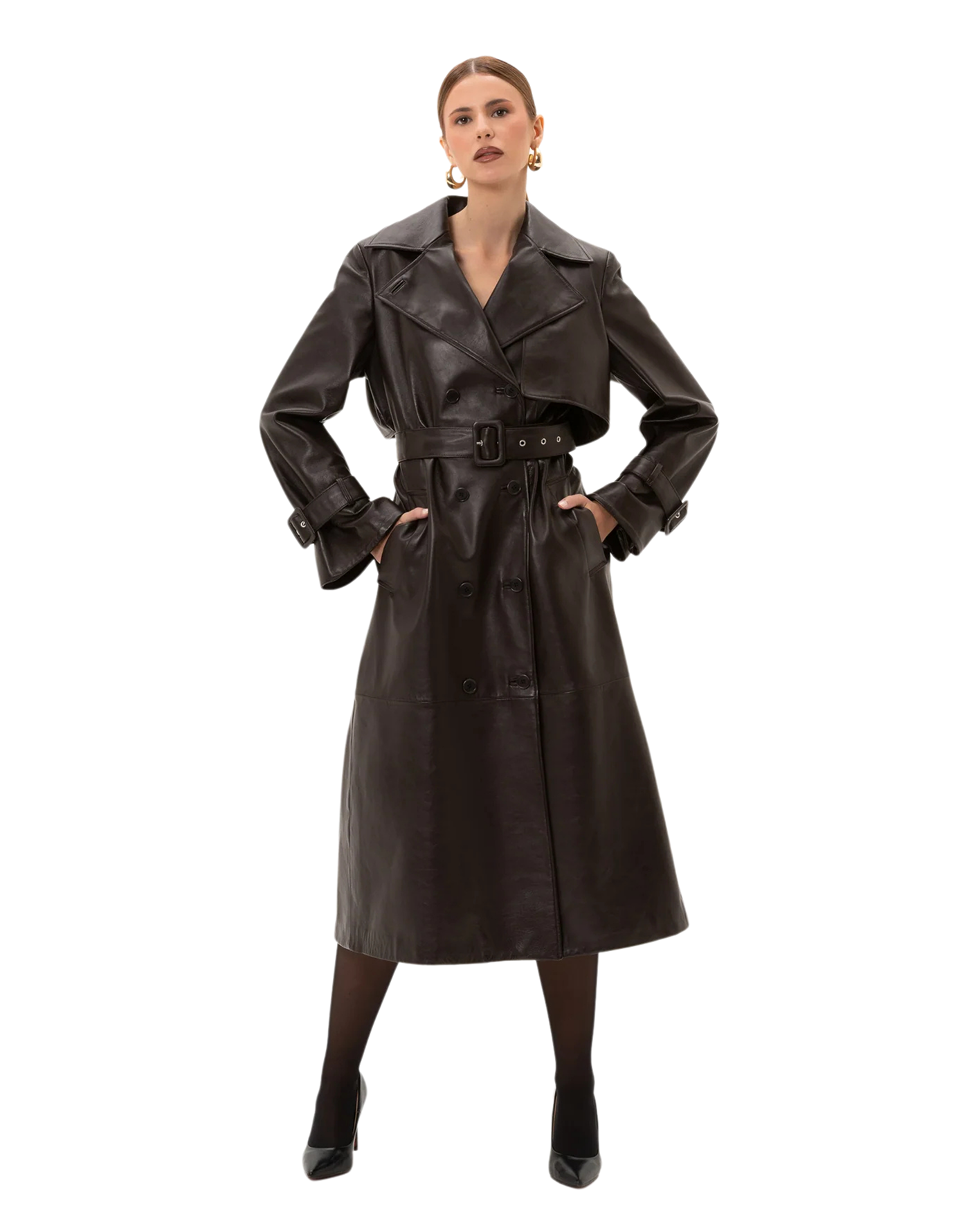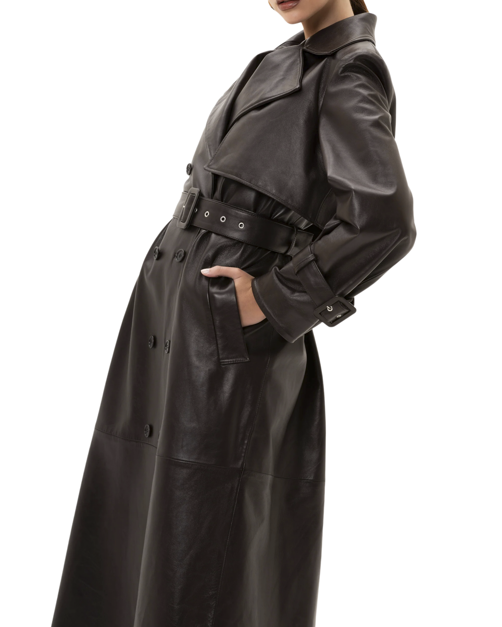 Trench in pelle di agnello, foderato con abbottonatura frontale, mostrine ai polsi, include cintura regolabile in tinta con fibbia, due tasche.
