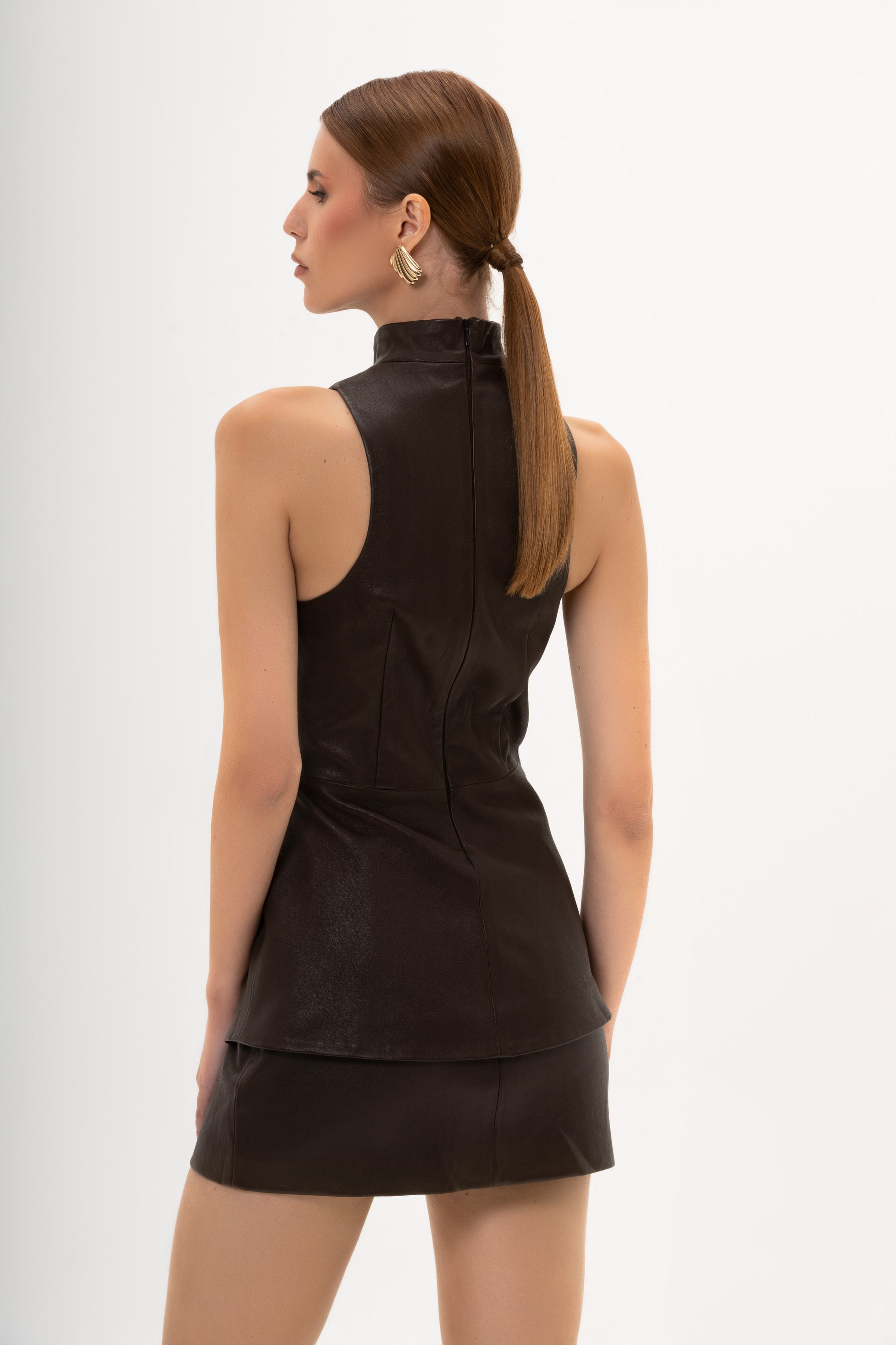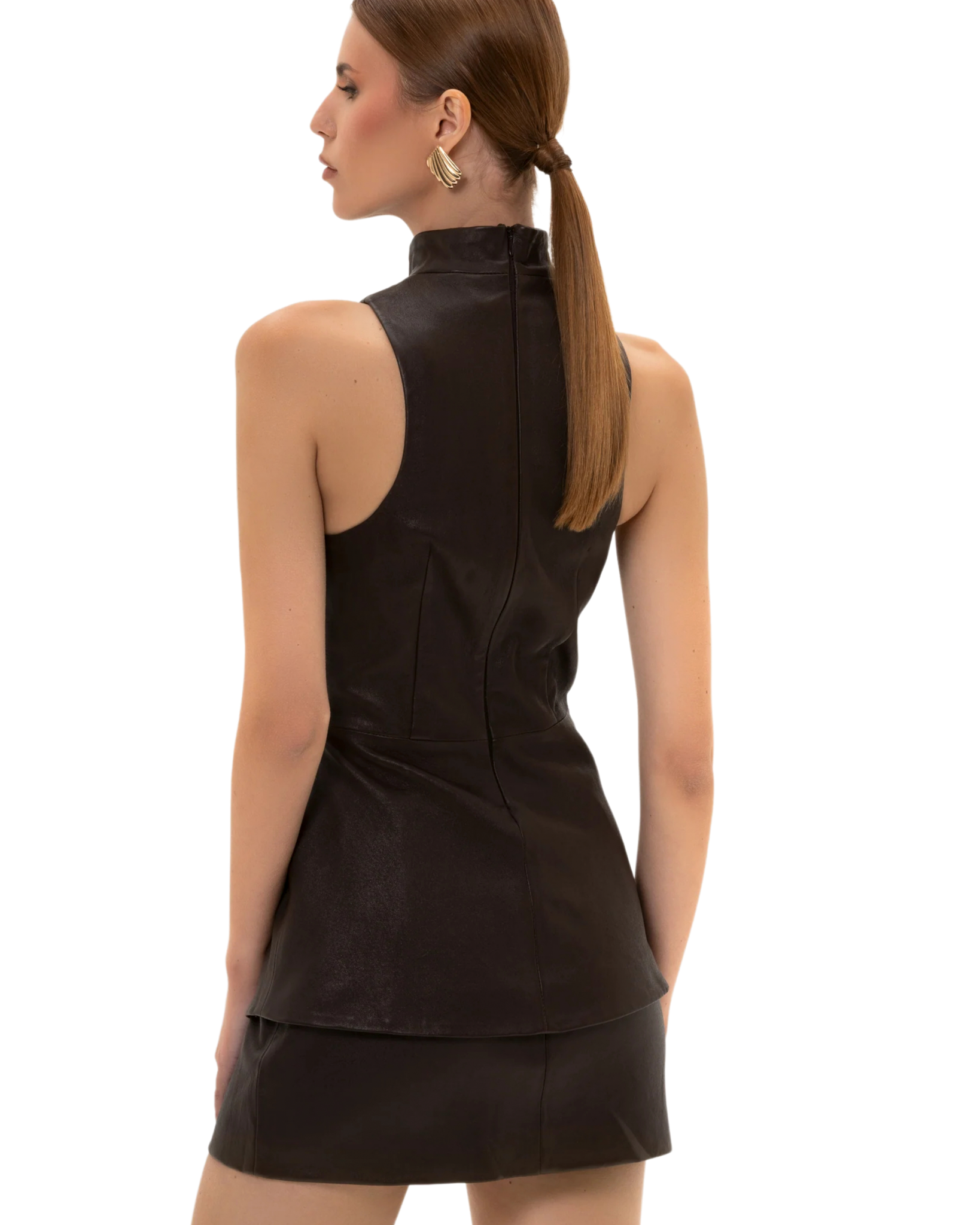 Top lungo in pelle elasticizzata, fasciante fino a sotto i fianchi, che valorizza la vite, con cerniera sul retro invisibile.