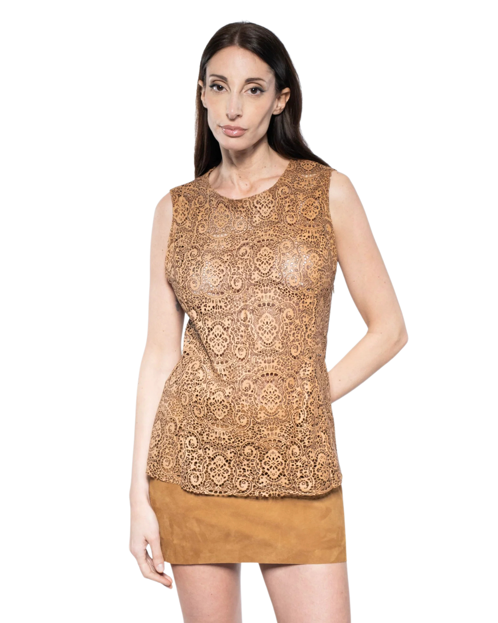 Top in camoscio con lavorazione floreale a laser, zip laterale.