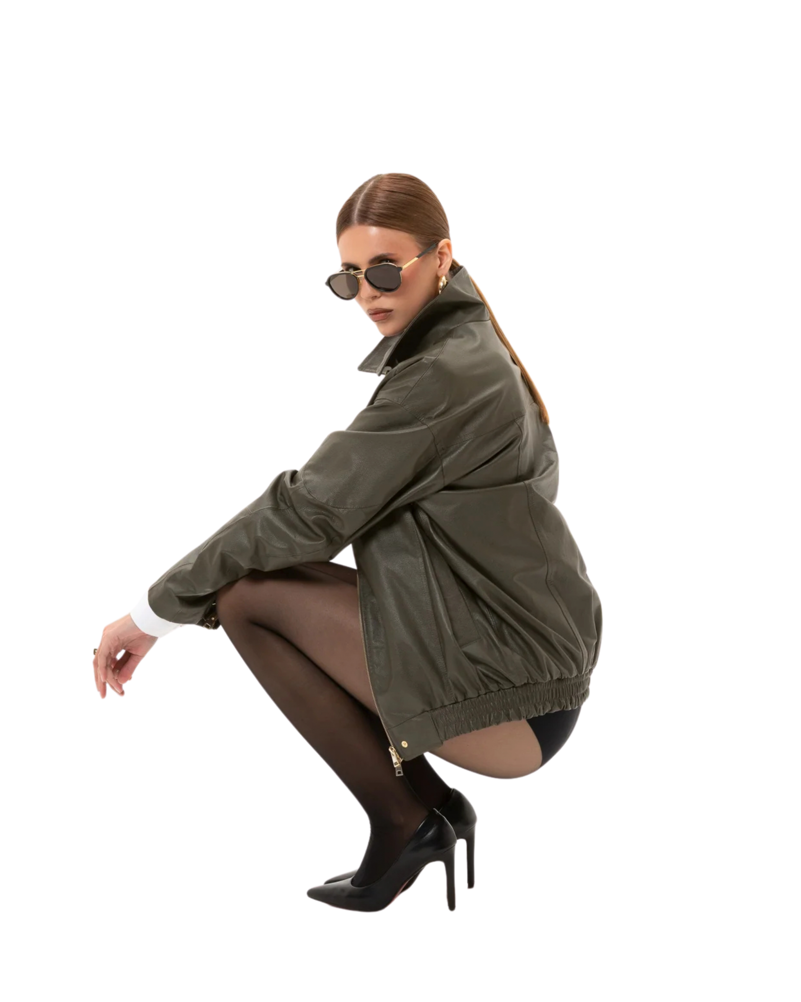 Bomber modello in pelle di agnello, foderato in caldo cotone , colletto a punta, spalle basse, chiusura con zip e bottoni.