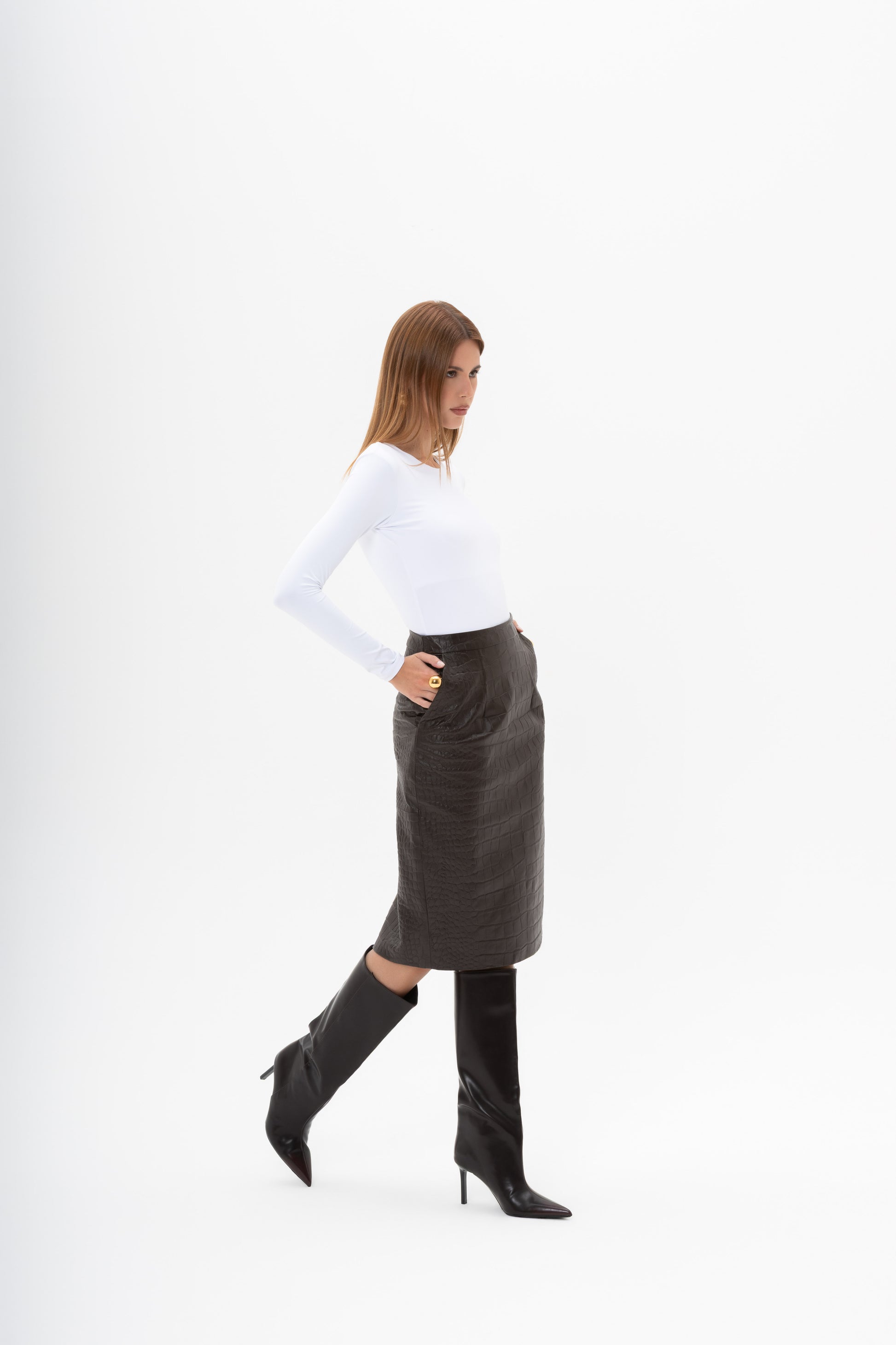 Gonna a matita midi con un’alta vita, in vera pelle con stampa coccodrillo mat, tasche anteriori , spacco e chiusura lampo posteriore nascosta nella cucitura.