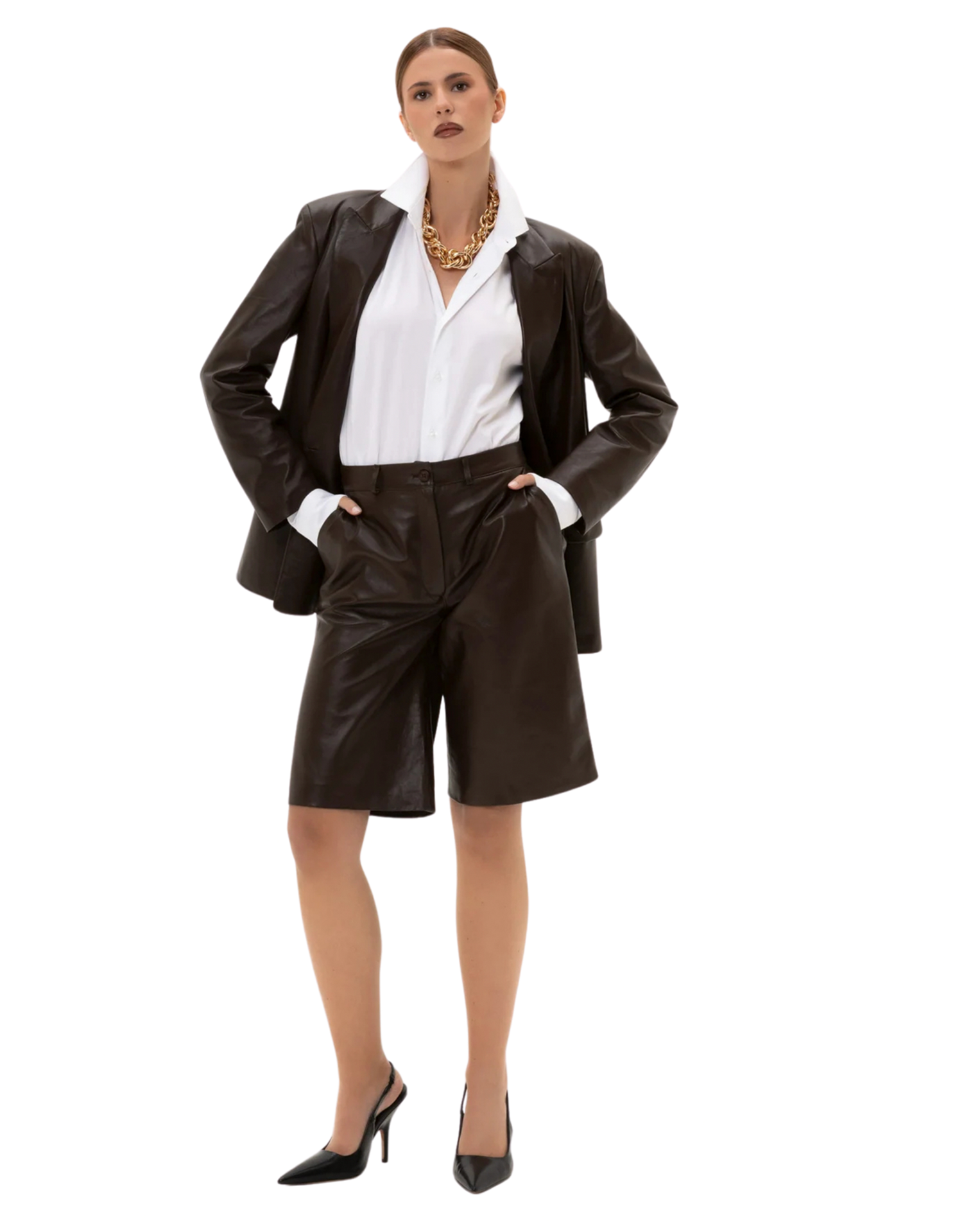 Shorts in morbidissima pelle di vitello, chiusura con cerniera e bottone tono su tono, tasche a fessura laterali e sul retro.