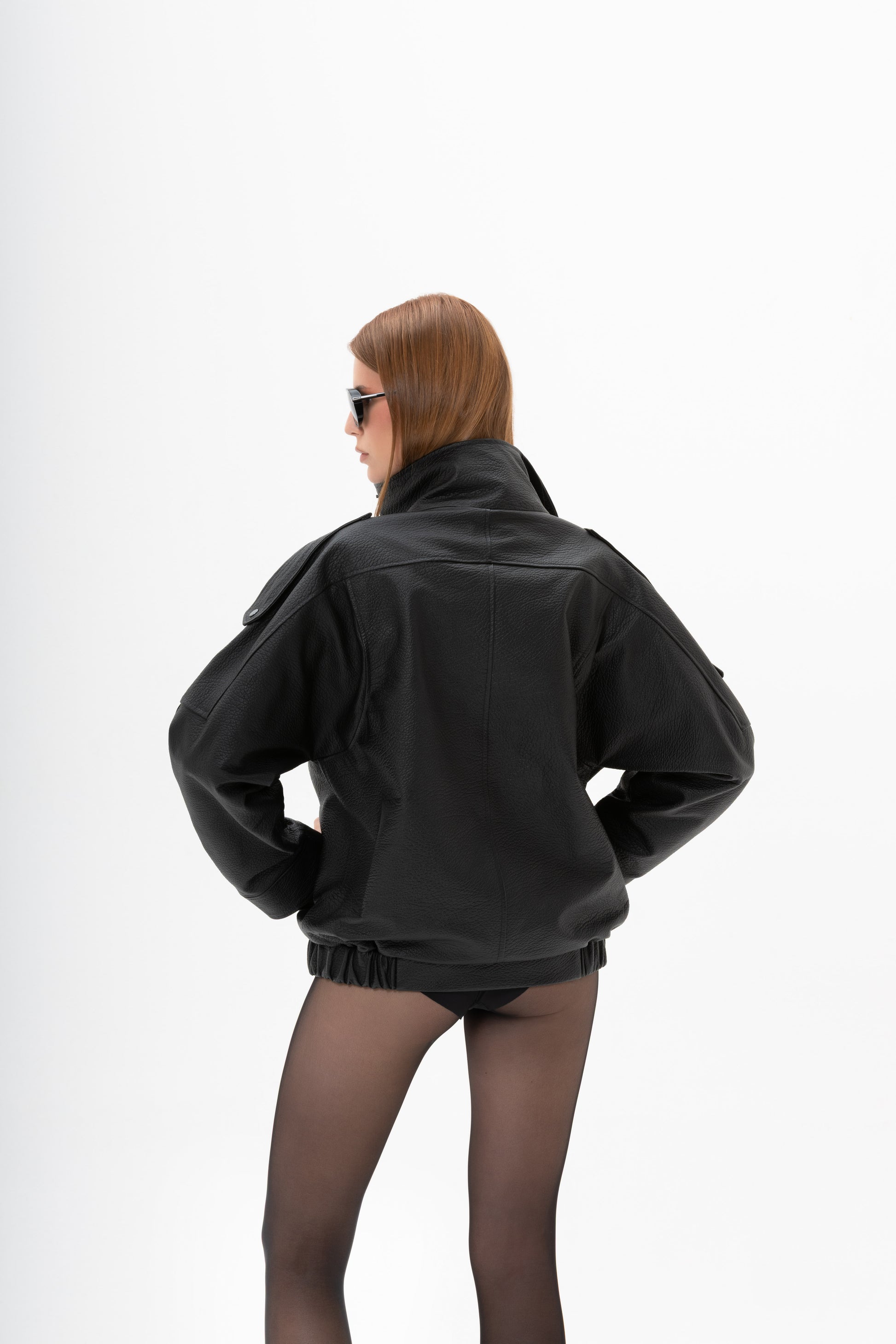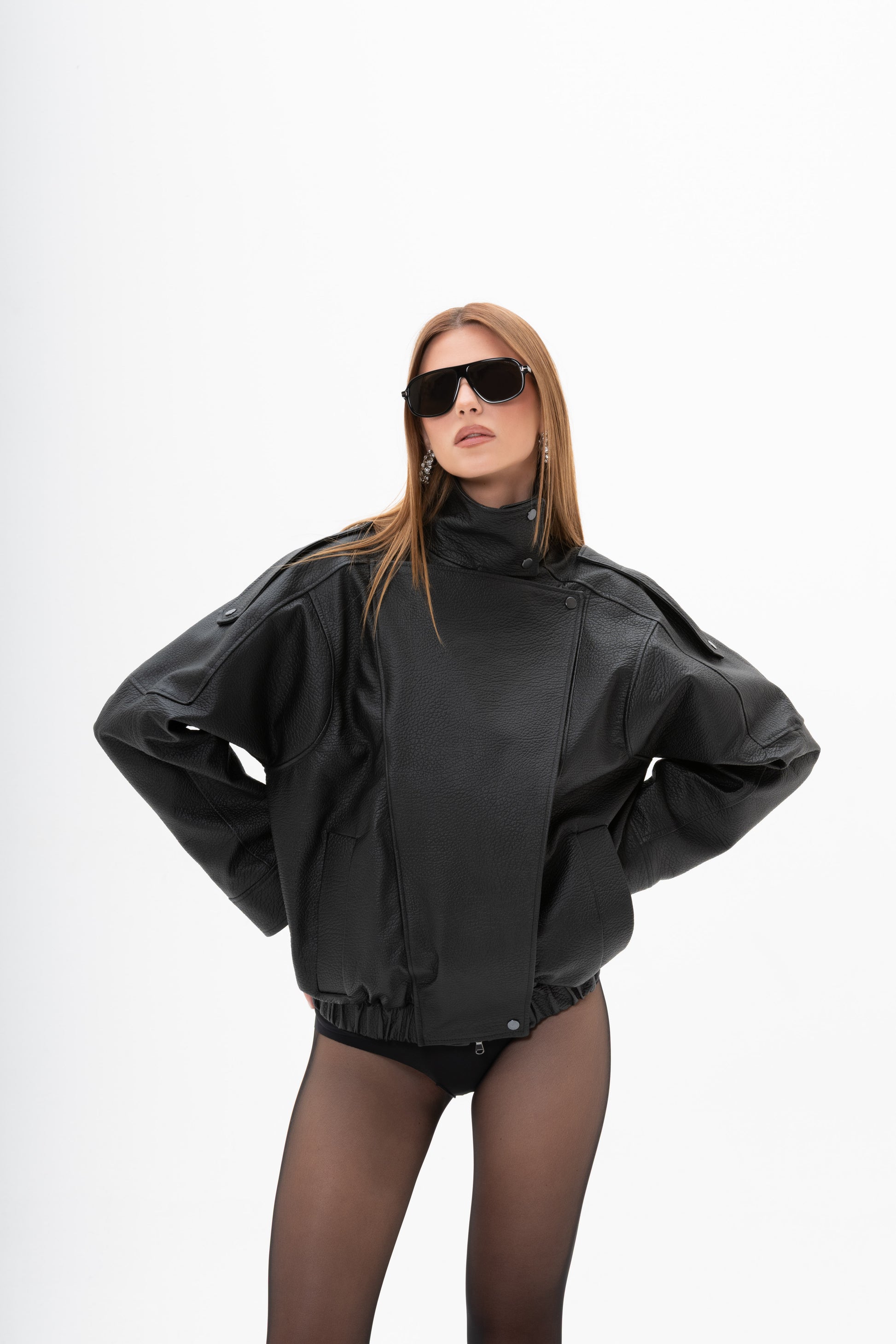 Giubbotto Over dal taglio oversize in 100% pelle martellata foderato in caldo cotone, con tasche laterali, collo alto, passante sulle spalle scese, cuciture curve, chiusura con cerniera e bottone, orlo leggermente arricciato.